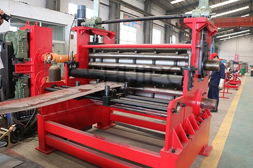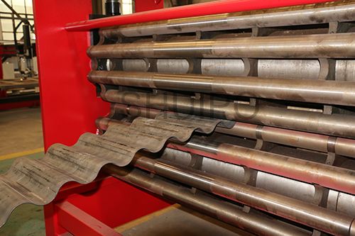 -  波纹板成型机主要分为机架、驱动部分、上压轮、下压轮、进料导向机构、以及前后工作台,波纹板自动成型机通过同时旋转的上、下压轮,将平板加工成波纹状,成型效果一致性好,效率高,波纹的高度调整有电机驱动。