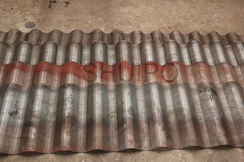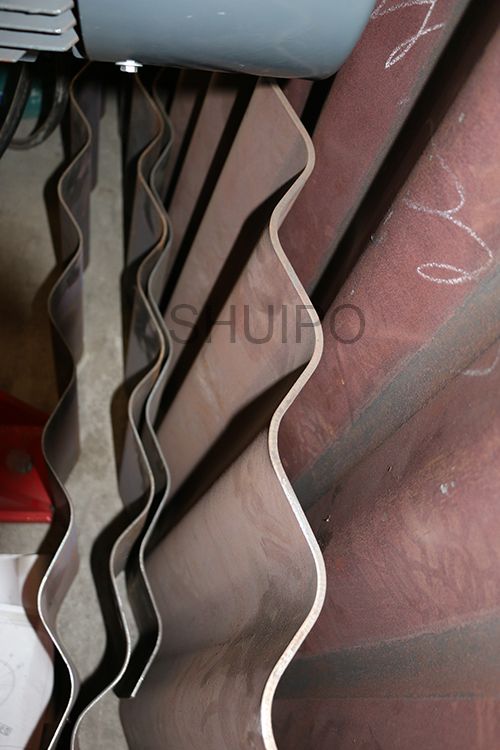 波纹板成型机主要分为机架、驱动部分、上压轮、下压轮、进料导向机构、以及前后工作台,波纹板成型机是通过同时旋转的上、下压轮,将平板加工成波纹状,成型效果一致性好,效率高,波纹的高度调整有电机驱动,通过操作控制箱上的按钮调整波纹高度范围,调整方便,性能可靠。