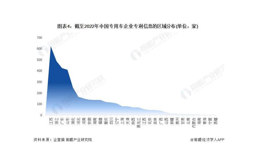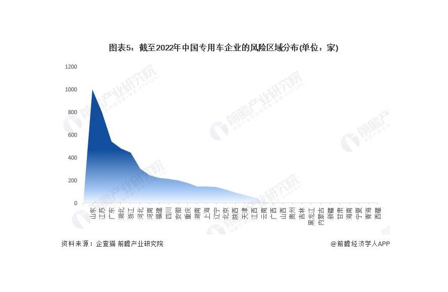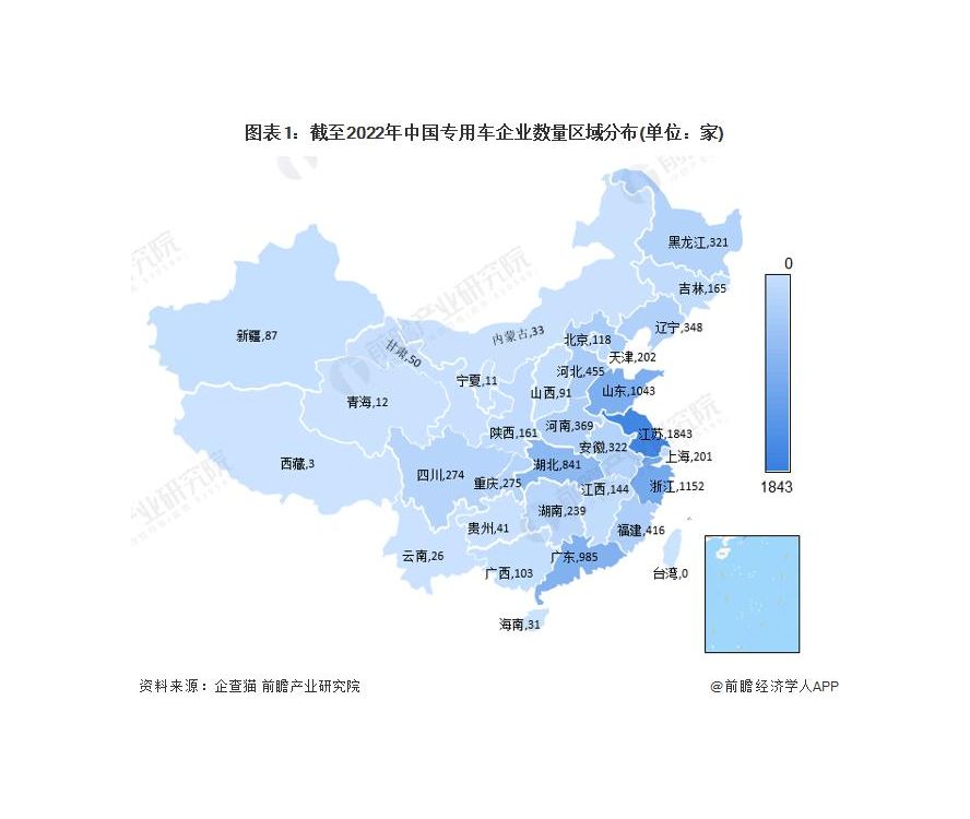 根据中国企业数据库企查猫,目前中国专用车企业主要分布在江苏、山东、浙江、广东、湖北等地,其中江苏企业数量最多。截至 2022 年 7 月中旬,江苏共有相关专用车企业数 1843 家。