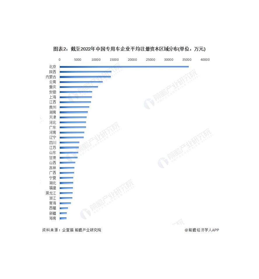 根据中国企业数据库企查猫,目前中国专用车企业的平均注册资本区域分布中,北京企业的平均注册资本最高,达到 35468 万元。