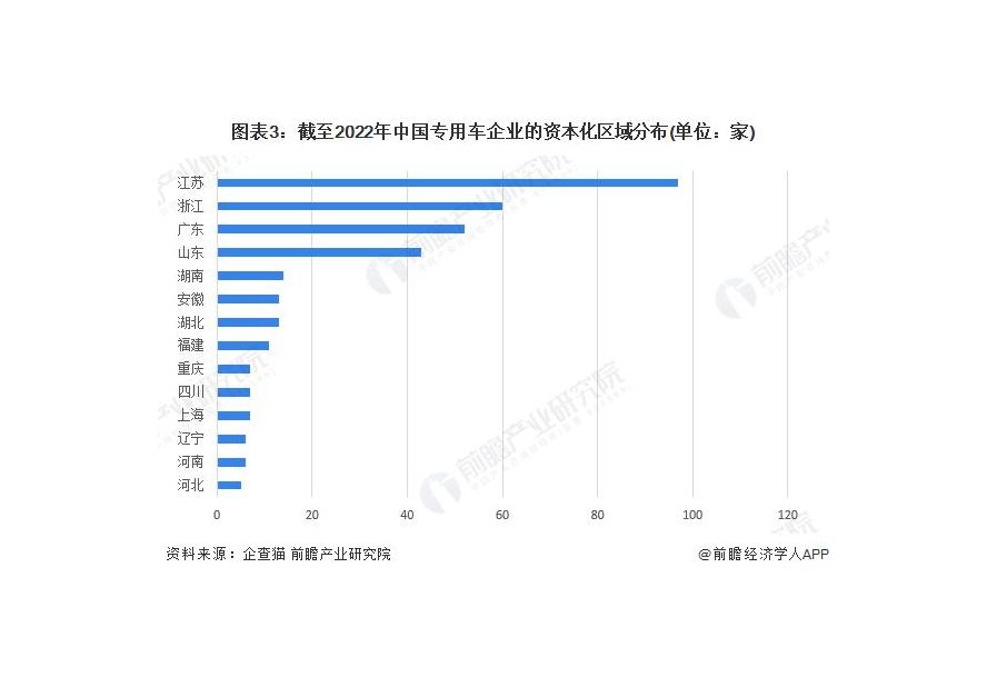 根据中国企业数据库企查猫,目前中国专用车资本化的企业 ( 有融资信息和上市信息 ) 的主要分布在江苏。截至目前,江苏省共有存续和在业的资本化企业共计 97 家,其次为浙江的 60 家。